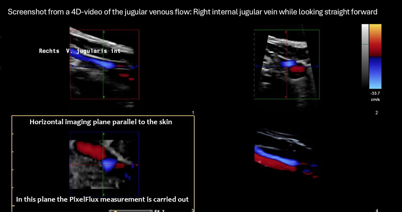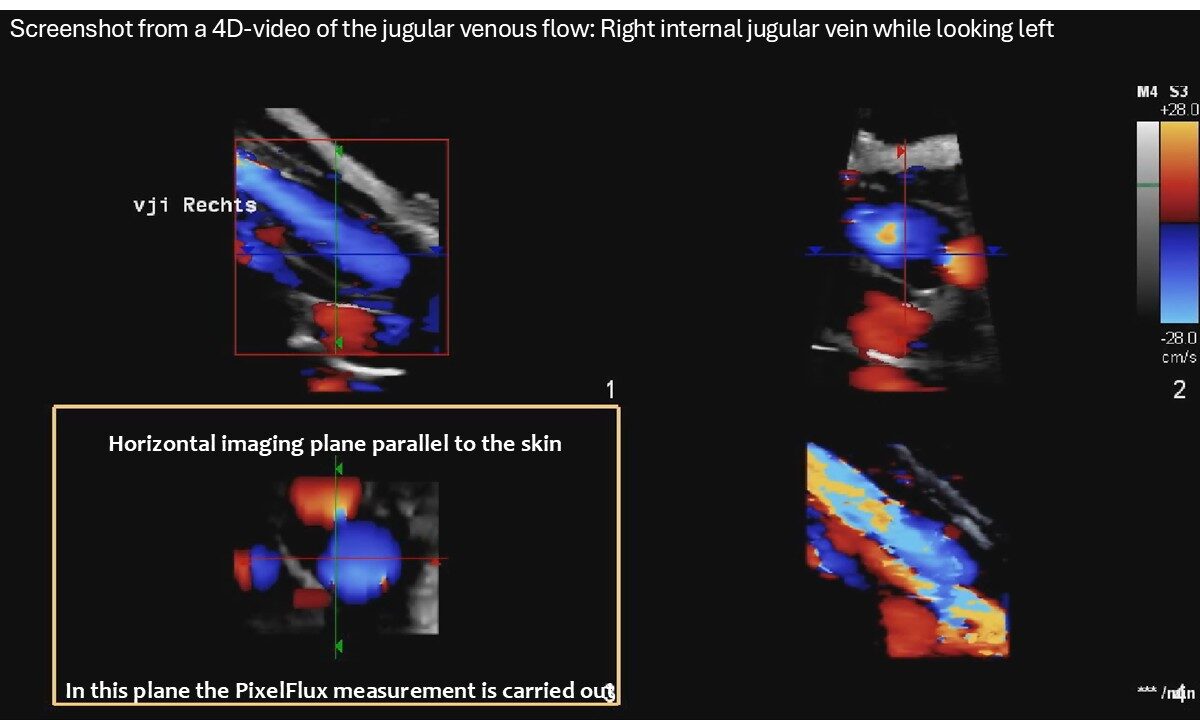 Dies ist der rationale Hintergrund für die quantitative Bestimmung des venösen Abflusses aus dem Schädel durch 4D-PixelFlux Volumenfluss -Messungen der Vena jugularis interna. Die Vena jugularis interna ist der bedeutendste Drainageweg des Hirns. Kompressionen dieses Gefäßes kommt daher eine besonders große Bedeutung zu. Die beiden weiteren Drainagewege sind die Venae vertebrales und der Venen des Plexus epiduralis. Diese Drainagewege aber werden durch die knöchernen Strukturen der Wirbelsäule begrenzt. Die Venae vertebrales verlaufen in den Knochenringen der Seitfortsätze der Halswirbelkörper und können sich daher bei vermehrtem Volumenangebot nicht bedeutsam erweitern. Auch die Venen des Plexus epiduralis können sich nicht frei ausdehnen, da sie im knöchernen Wirbelkanal liegen.