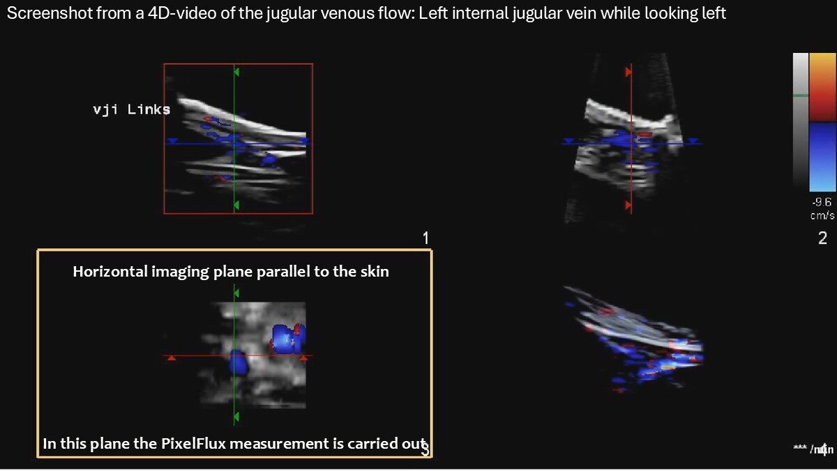 Bei diesem Patienten zeigte die 4D- PixelFlux -Blutvolumenflussmessung der Jugularvenen eine drastische Veränderung auf der linken Seite, sobald der Patient nach links blickte. Dies war genau jene Situation, die beim Patienten die Lautstärke des Tinnitus deutlich erhöhte.