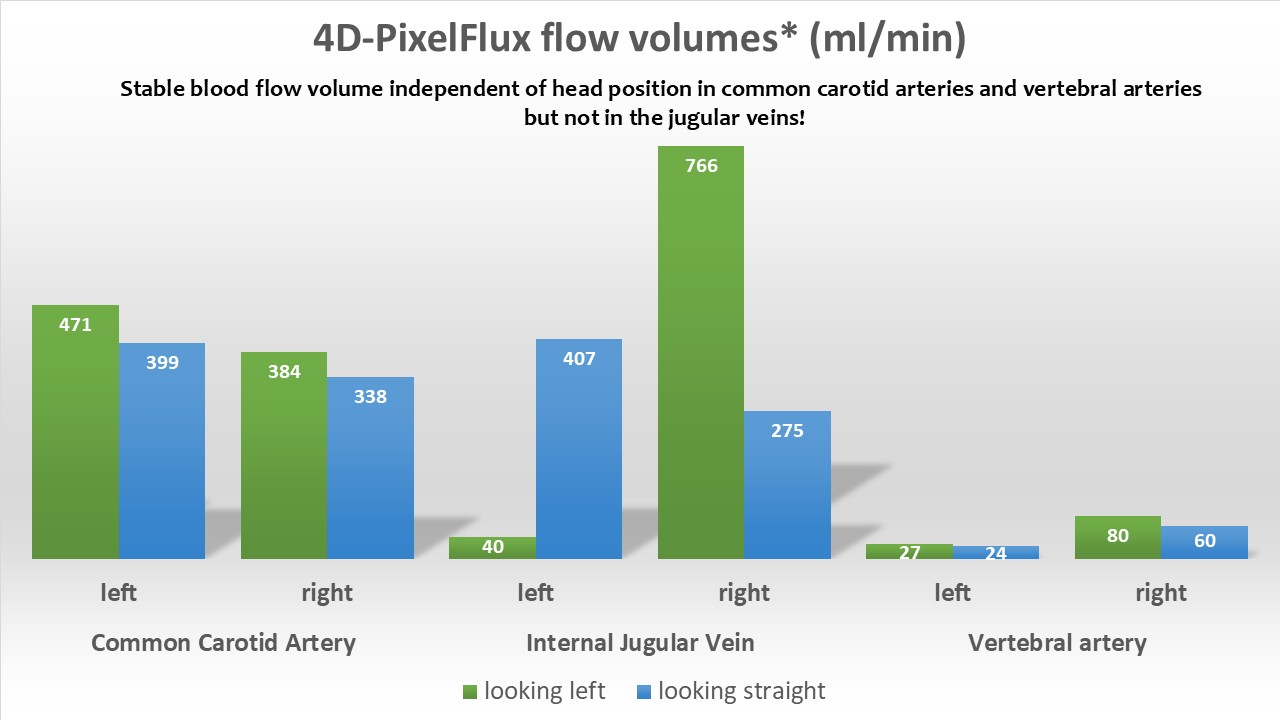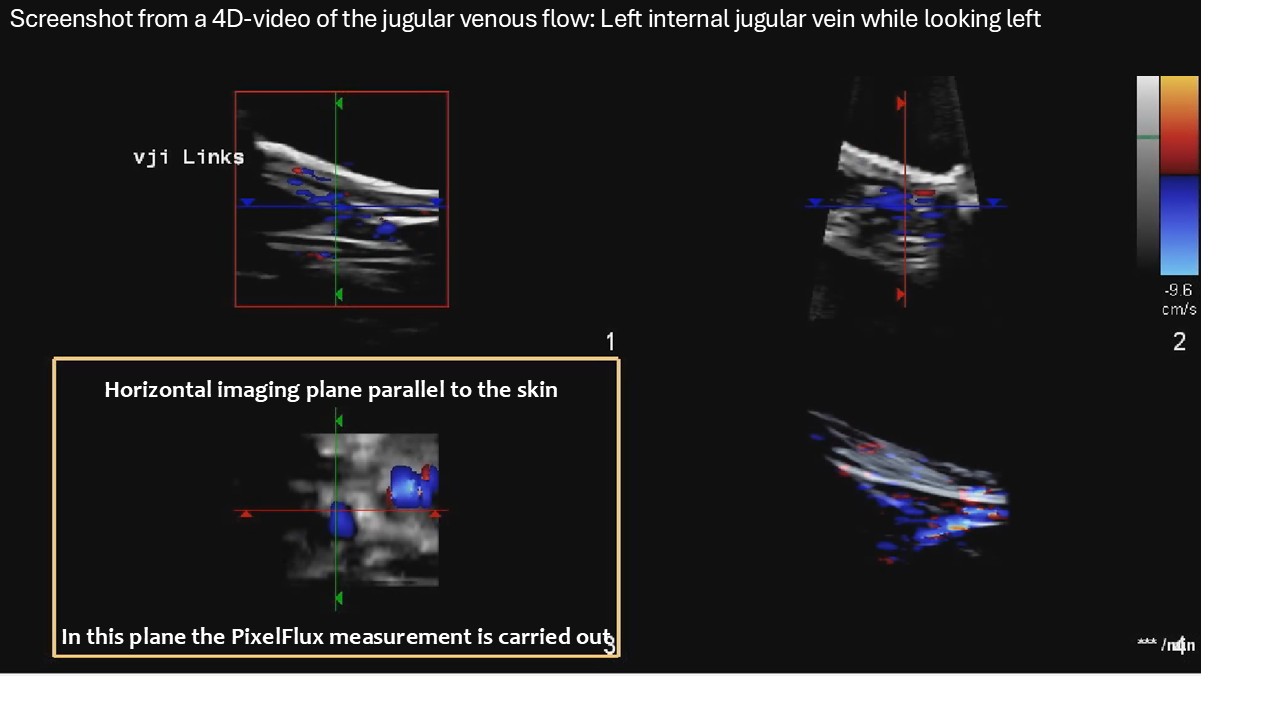 In this patient, 4D PixelFlux blood volume flow measurement of the jugular veins revealed a dramatic change on the left side when the patient turned their head to the left. This precisely increased the volume of the patient’s tinnitus.