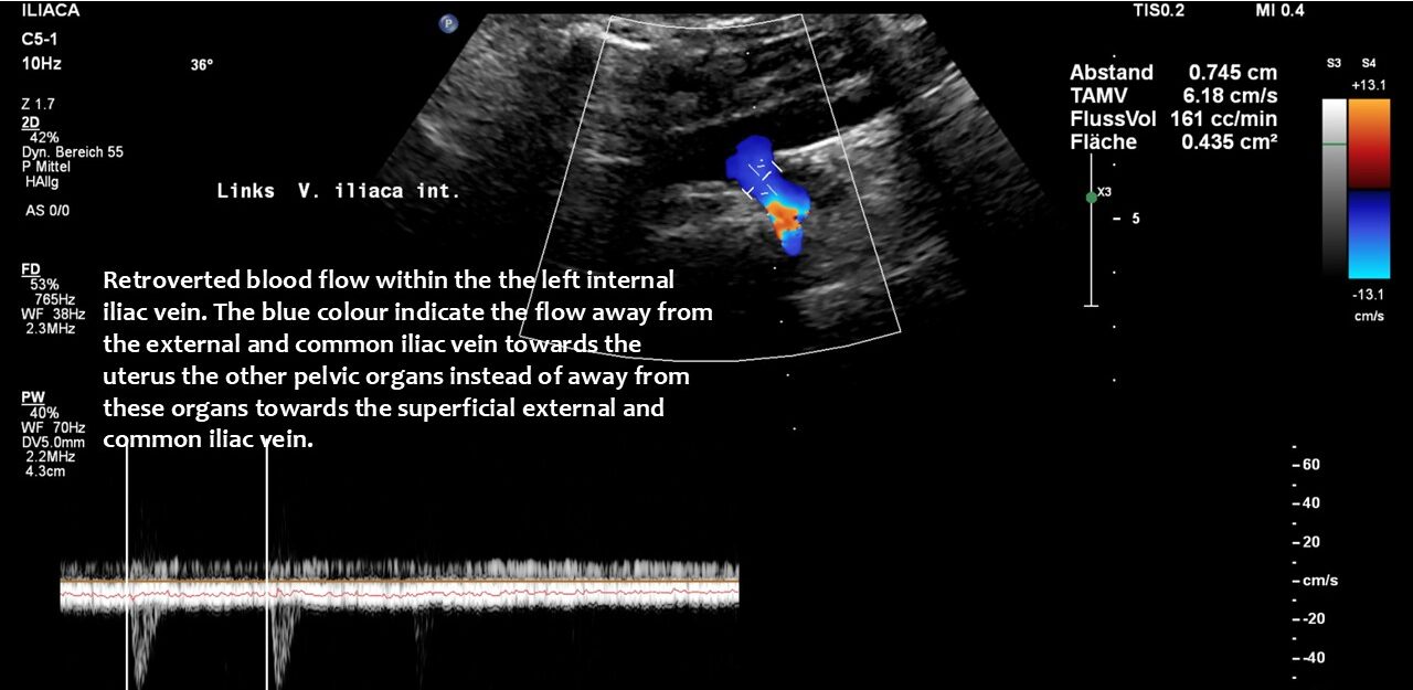 - Subtotal compression of the left common iliac vein with clinical consequences as frequent voiding, severe menstrual pain and pain and heaviness of the left leg- May-Thurner syndrome