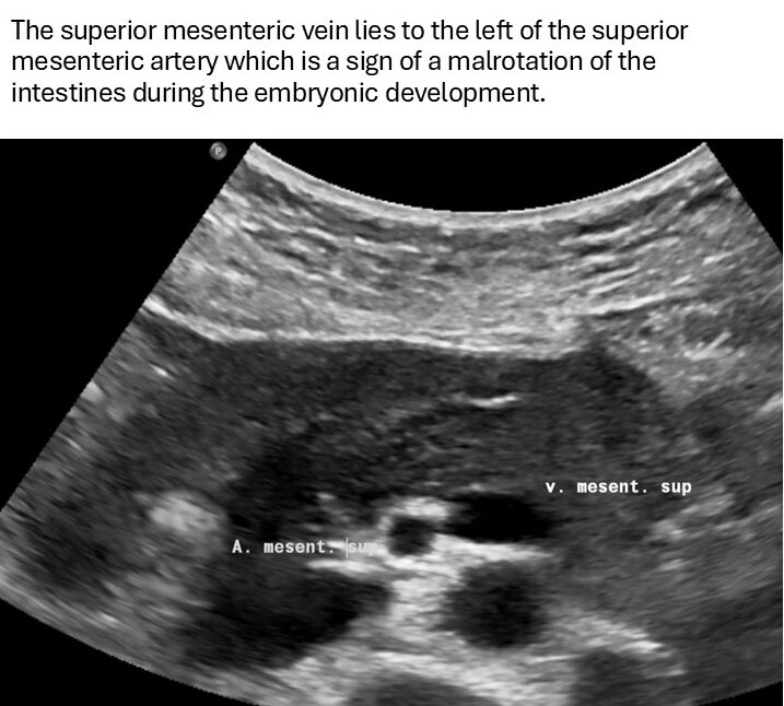 The patient was born with a malrotation of the foregut. This means that the positioning of the small bowel is not evenly distributed towards the left and right sides of the abdomen. Instead, the small intestines are located mainly on one side of the abdomen. In addition, the positions of the blood vessels of the mesentery were exchanged. Normally, the superior mesenteric vein enters the splenic vein on the right side of the superior mesenteric artery. In this patient, it enters left to the superior mesenteric artery.