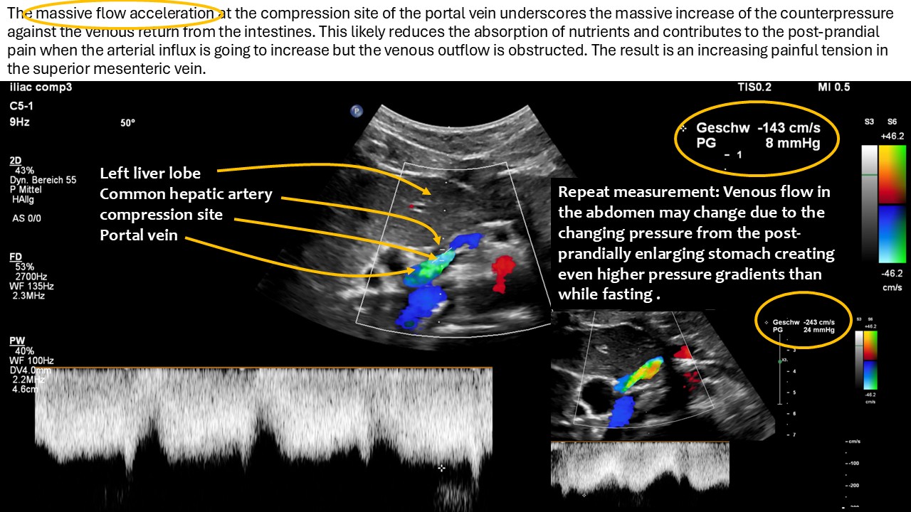 Since the common hepatic artery compressed the portal vein significantly with a flow acceleration to 147 cm/s the pressure within the splenic vein was completely transferred onto the venous return from the small bowel via the superior mesentric vein.