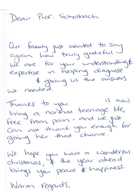 ich möchte mich gerne nochmals bei Ihnen für Ihre Hilfe und Unterstützung bedanken. Durch Ihre Diagnosen konnte endlich der Heilungsprozess beginnen und die dafür notwendigen Therapien starten. Auch möchte ich Ihnen für Ihr Mitgefühl sowie Ihr Verständnis danken. …